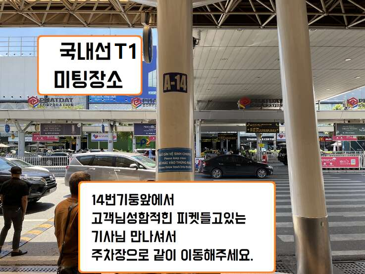 출구 나오셔서 건물밖 A-14번 기둥에서 고객님 성함적힌 피켓들고있는 기사와 미팅후 주차장으로 같이 이동해주세요.