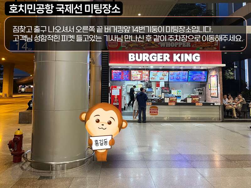 짐찾고 출구 나오셔서 오른쪽 끝으로 가시면 버거킹(Burger King) 이 있습니다. 그 앞 14번기둥에서 미팅합니다.